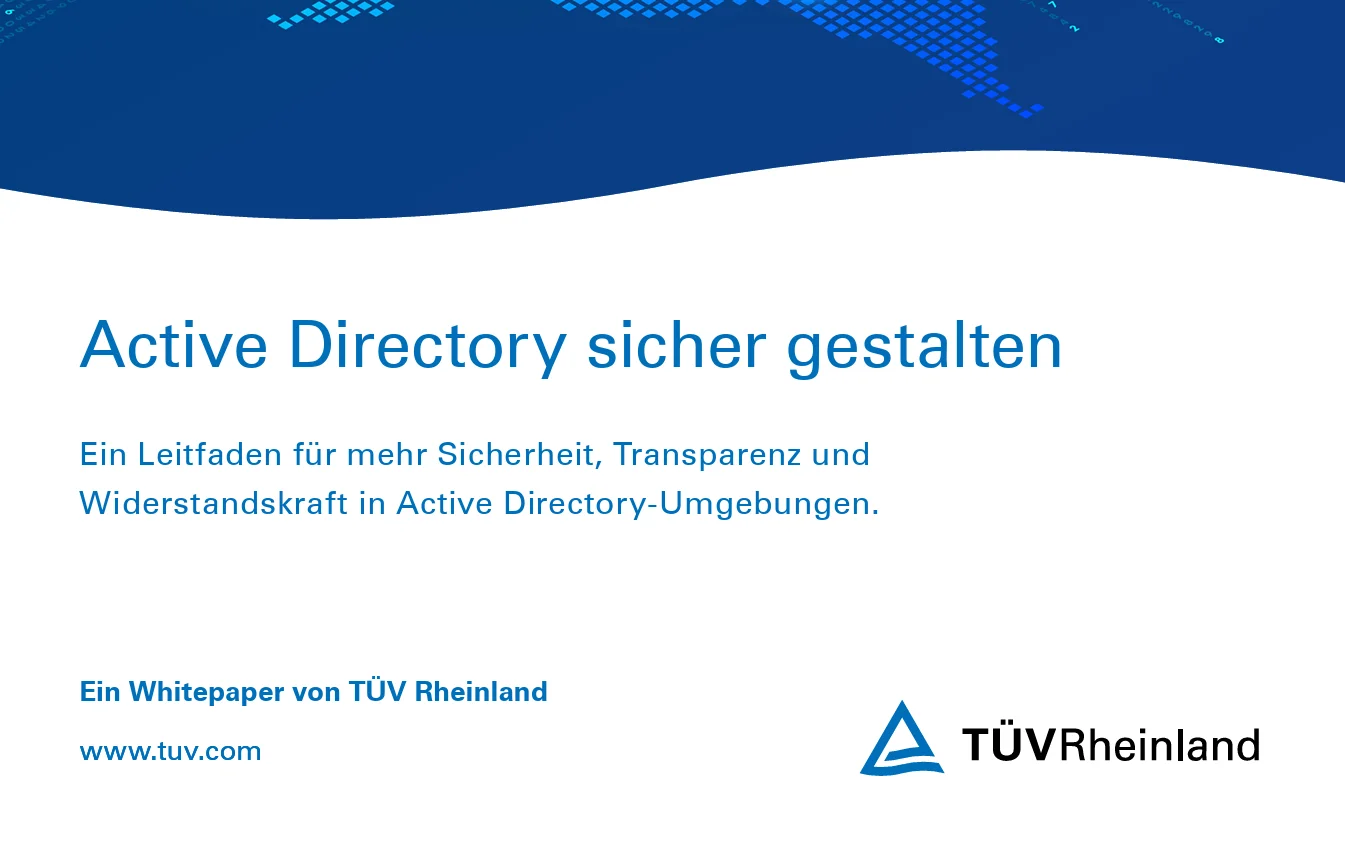 | Microsoft Active Directory ist eine attraktive Angriffsfläche für Cyberkriminelle. Ein Whitepaper des TÜV Rheinland zeigt, wie groß die Risiken sind – und was Organisationen dagegen tun können. | Microsoft Active Directory is an attractive target for cybercriminals. A whitepaper by TÜV Rheinland illustrates the severity of the risks and how organizations can mitigate them. |