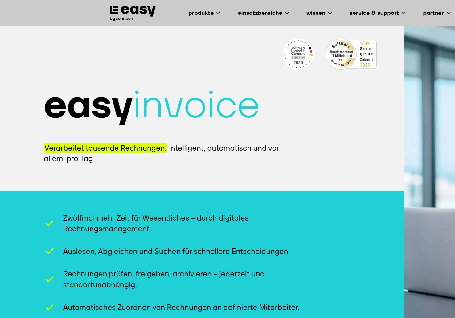 easy invoice 6 bietet KI-gestützte Rechnungsverarbeitung, verkürzte Implementierungszeiten und webbasierte Workflows für mehr Effizienz. | easy invoice 6 offers AI-powered invoice processing, shorter implementation times, and web-based workflows for greater efficiency. |