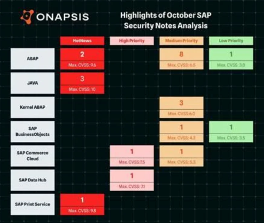 For the October Patch Day 2025, SAP has released 23 new and updated security notes, including six classified as HotNews vulnerabilities. Notably critical: three new HotNews notes were created in collaboration with Onapsis Research Labs, addressing deserialization vulnerabilities, directory traversal attacks, and insecure file uploads. With CVSS scores of up to 10.0, these vulnerabilities are among the most severe of the year. The three most important security notes are #3660659 (CVSS 10.0), #3630595 (CVSS 9.8), and #3647332 (CVSS 9.0).