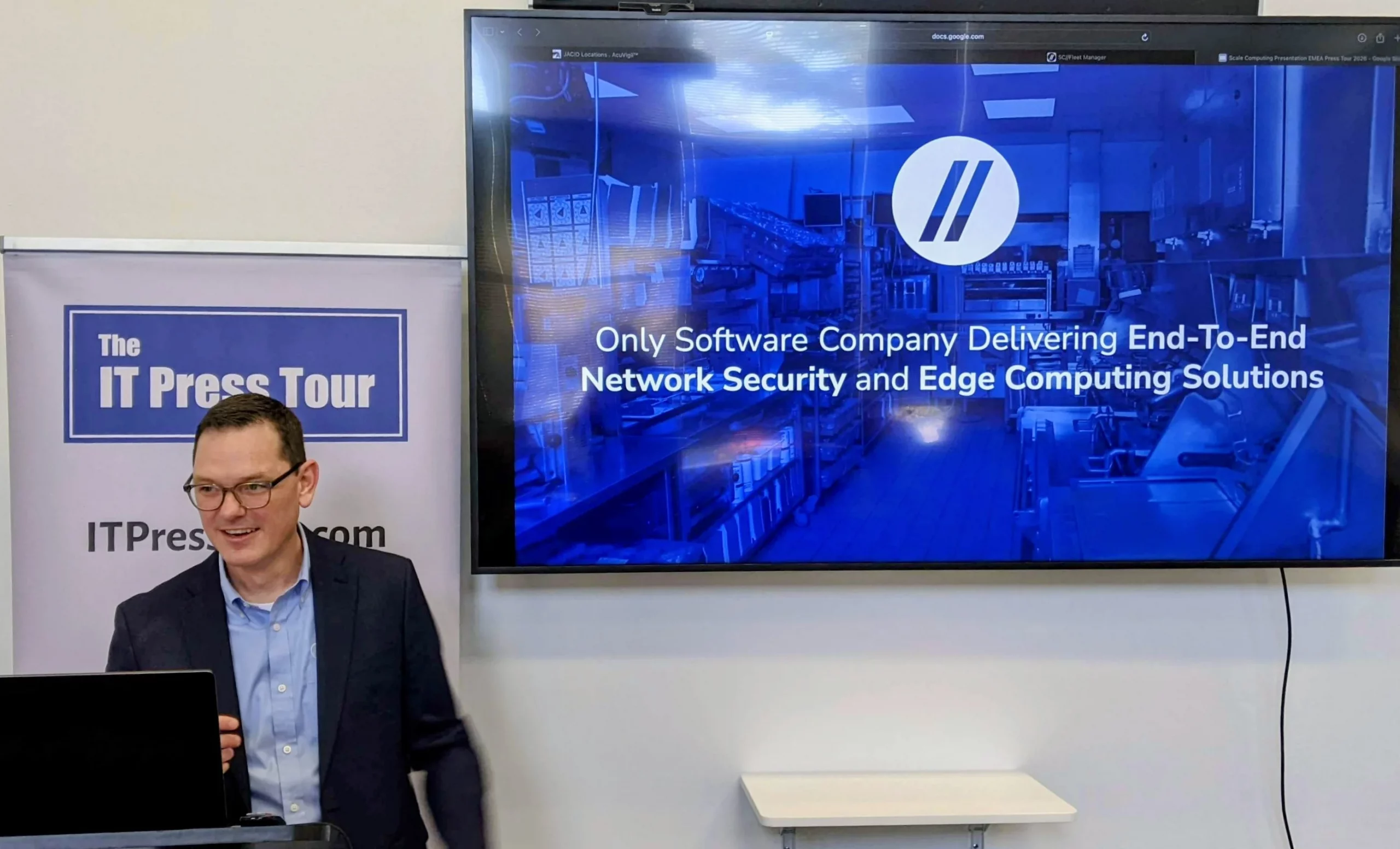 | Scale Computing verbindet Edge-Computing mit Netzwerksicherheit und verwaltet verteilte Standorte über eine integrierte Virtualisierungsplattform, wie auf der IT Press Tour gezeigt. | Scale Computing merges edge computing with network security, managing distributed sites through integrated virtualization platform as shown on IT Press Tour. |