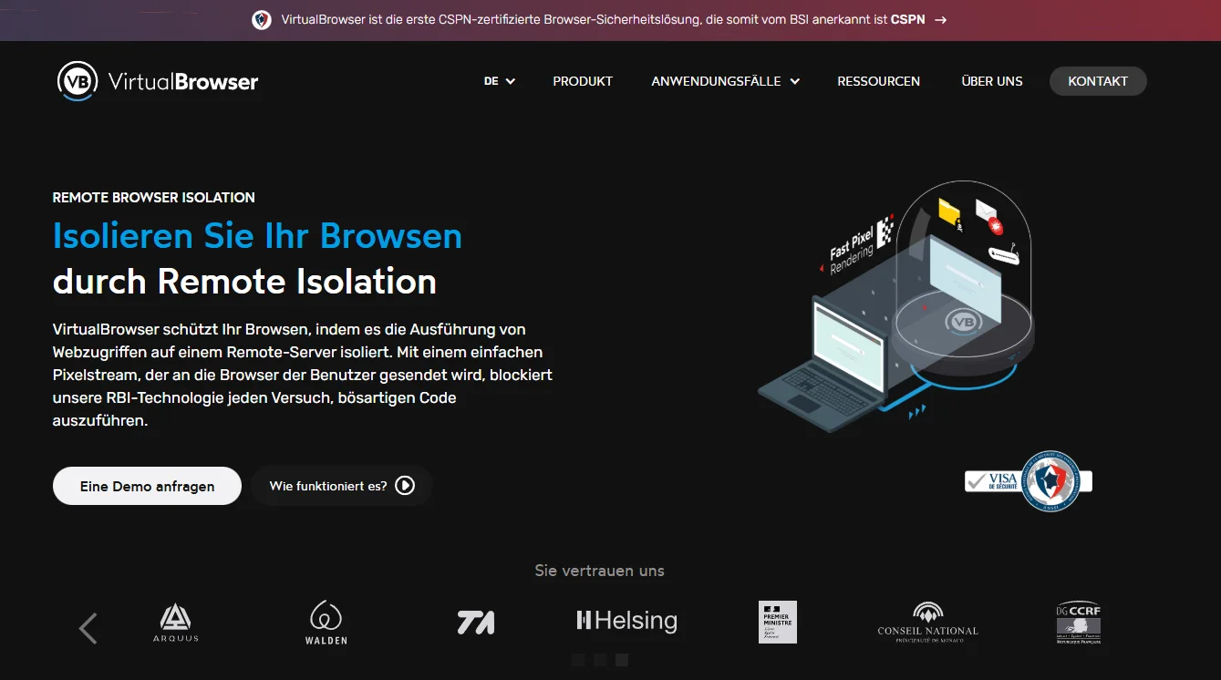 | Der französische Spezialist für Remote Browser Isolation VirtualBrowser hat die Zertifizierung der ersten Sicherheitsstufe (CSPN) durch die Cybersicherheitsbehörde ANSSI erhalten. Das Bundesamt für Sicherheit in der Informationstechnik erkennt diese Zertifizierung aufgrund eines bilateralen Abkommens an. In Deutschland nutzen bereits Unternehmen wie Helsing und das Ernst von Bergmann Klinikum Potsdam die Technologie.